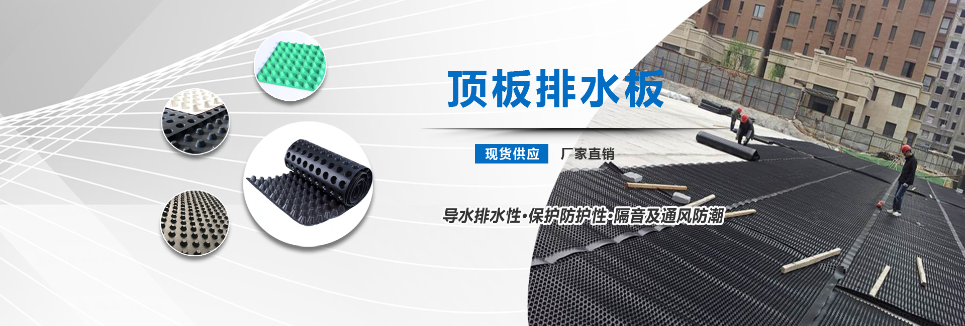 排水板是由聚苯乙烯(HIPS)或者是聚乙烯(HDPE)塑膠底板經(jīng)過沖壓制成圓錐突臺(tái)或者加勁肋的凸點(diǎn)(或中空?qǐng)A柱形多孔)而成,幅寬有3米,長度有10米或者是15米。 施工中常用的排水